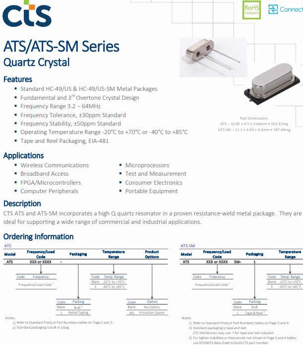 CTS晶振公司的石英諧振器ATS12ASM-1支持廣泛的商業應用