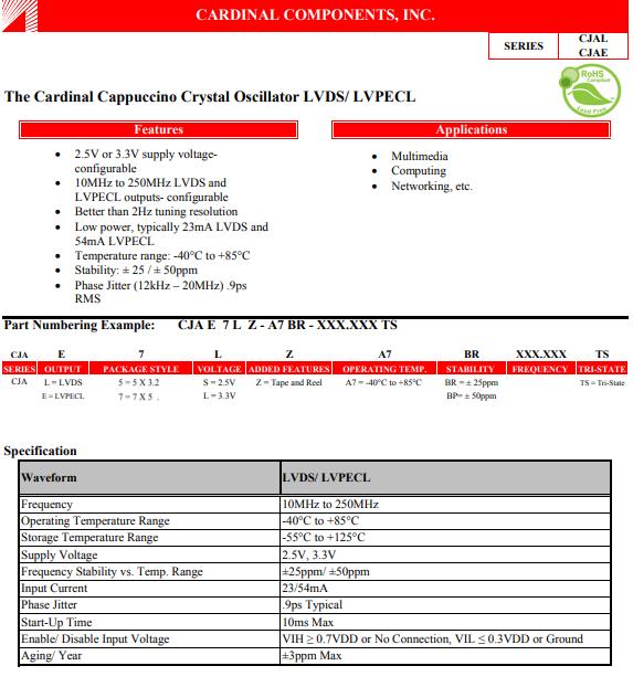編碼CJAE7L-A7BR-75.49472TS是一款尺寸為7.0*5.0mm,XO(標準)時鐘振蕩器,有源振蕩器,頻率75.49472MHz,輸出LVPECL,啟用/禁用,6-SMD,無引線,2.5V或3.3V電源電壓可配置,10MHz至250MHz LVDS和LVPECL輸出-可配置,優(yōu)于2Hz的調(diào)諧分辨率,低功耗,通常為23mA LVDS和LVPECL,溫度范圍:-40℃~ +85℃,穩(wěn)定性:±25 /±50ppm,相位抖動(12kHz - 20MHz) .9ps RMS