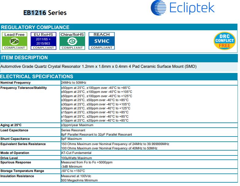 EB3250YA12-16.000M TR Ecliptek晶振 CRYSTAL 16.0000MHZ 12PF SMD -40°C ~ 125°C