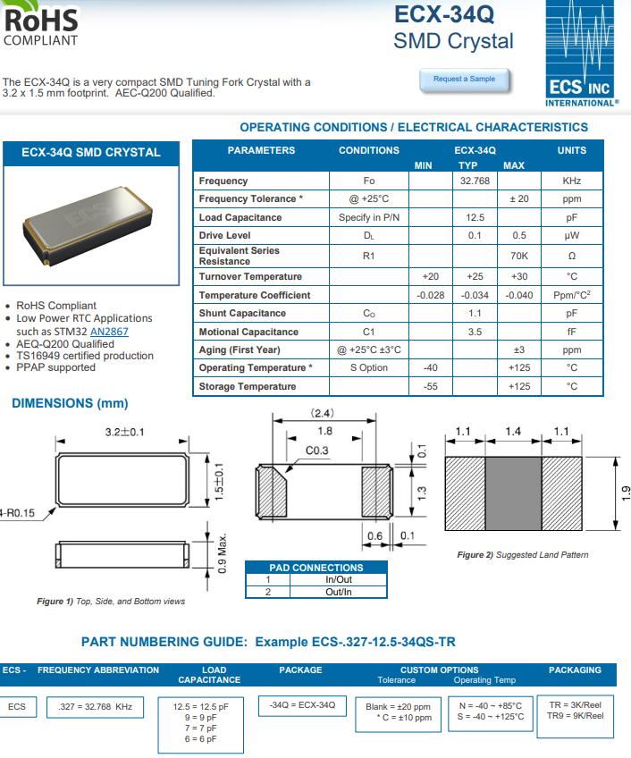 | ECS-.327-12.5-34QCS-TR | ECS晶振 | ECX-34Q | 32.768kHz | -40°C ~ 125°C |