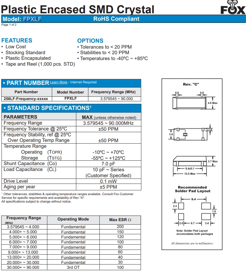 | FPXLF040 | FOX晶振 | FPXLF | MHz Crystal | 4MHz | ±50ppm |