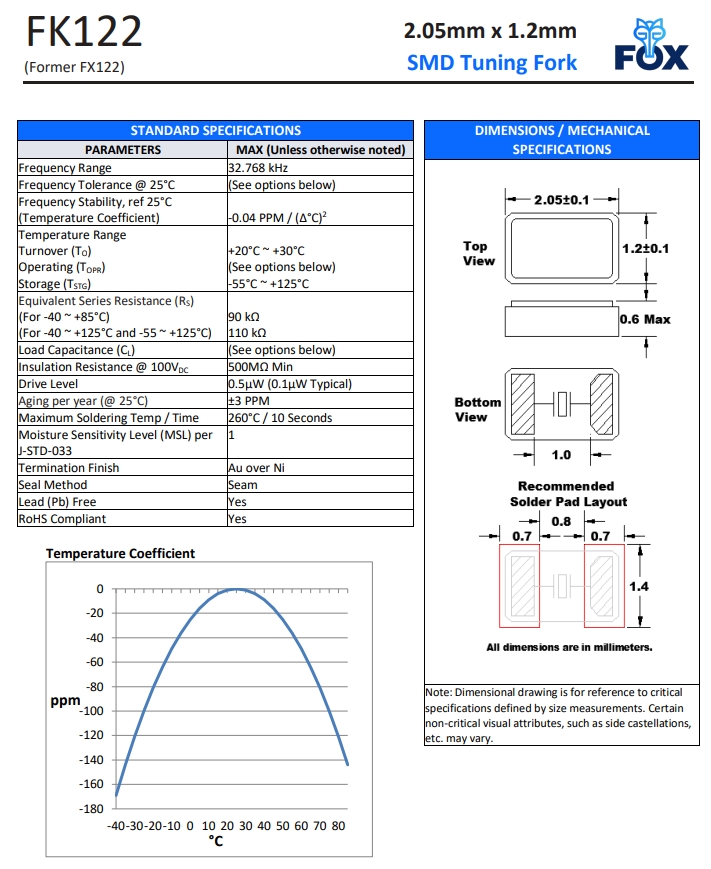 | FX122-327 | 福克斯晶振 | FX122 | kHz Crystal (Tuning Fork) | 32.768kHz | - |