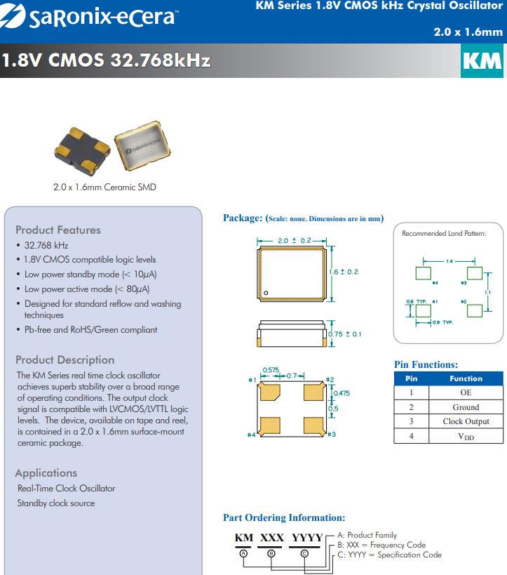 KM3270002特性:32.768千赫,1.8V CMOS兼容邏輯電平,低功耗待機(jī)模式(< 10μA),低功率有功模式(< 80μA),設(shè)計為標(biāo)準(zhǔn)回流和清洗技術(shù),無鉛,符合RoHS/綠色標(biāo)準(zhǔn)