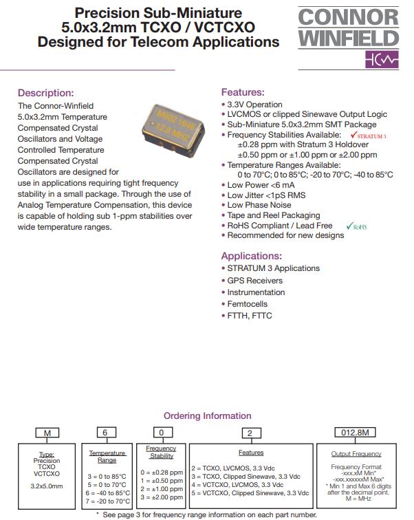 迷你型的康納溫菲爾德TCXO振蕩器M602-040.0M超級適合GPS接收器,康納溫菲爾德公司利用自身高超的生產(chǎn)技術(shù),開發(fā)溫補晶振編碼M602-040.0M,Connor-Winfield的5.0x3.2mm溫度補償晶體振蕩器和電壓控制溫度補償晶體振蕩器設(shè)計用于適用于要求嚴格頻率的應(yīng)用場合小包裝的穩(wěn)定性。通過使用模擬溫度補償,這個裝置是否能夠保持低于1ppm的穩(wěn)定性溫度范圍寬。