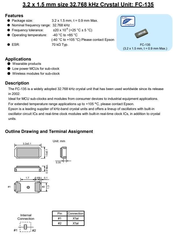 | Q13FC1350003900 | 3.2 x 1.5 x 0.9 mm | FC-135 | 32.768kHz | 7.5 pF | +/-10.0 ppm | -40 to +85 °C |