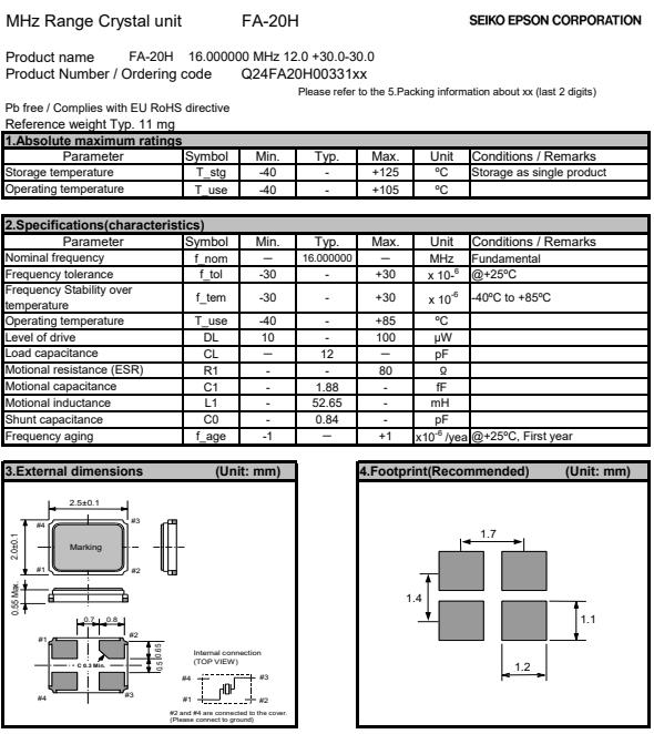 | Q24FA20H0033100 | 2.5 x 2 x 0.55mm | FA-20H | 16.000000 MHz | 12 pF | +/-30 ppm | -40 to +85 °C |