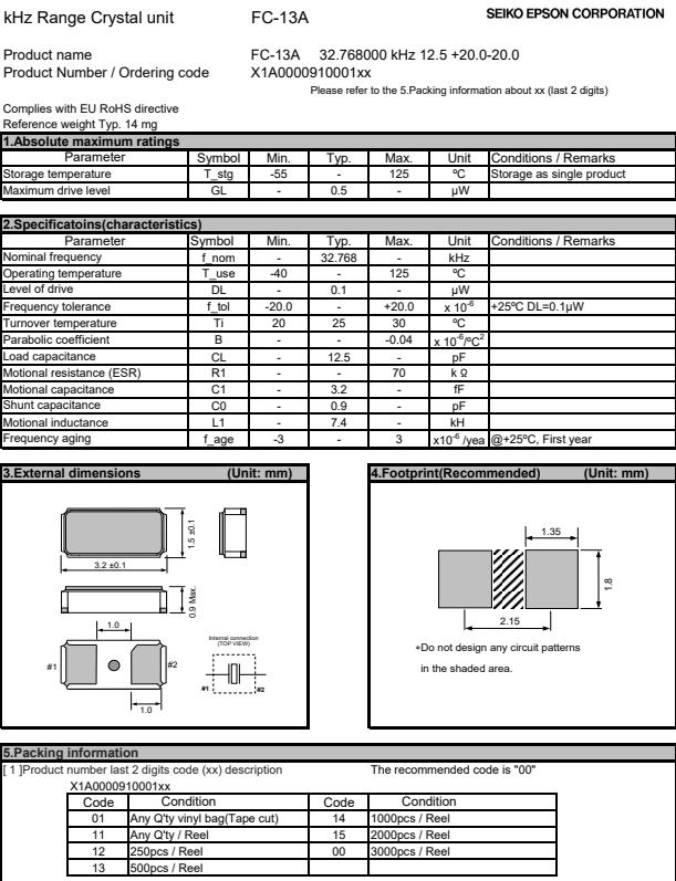 | X1A000091000500 | 3.2 x 1.5 x 0.9 mm | FC-13A | 32.768kHz | 9 pF | +/-20.0 ppm | -40 to +125 °C |