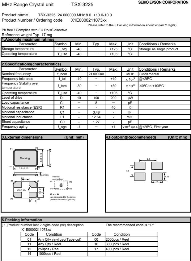 | X1E000021106316 | 3.2 x 2.5 x 0.6mm | TSX-3225 | 24.576000 MHz | 7 pF | +/-10 ppm | +/-18 ppm | -40 to +85 °C |