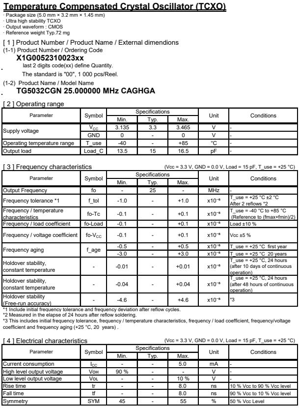 | X1G005231002300 | TG5032CGN | 25.000000 MHz | 5.00 x 3.20 x 1.45 mm | 3.135 to 3.465 V | +/-1.0 ppm | -40 to ++85 °C | +/-0.10 ppm |