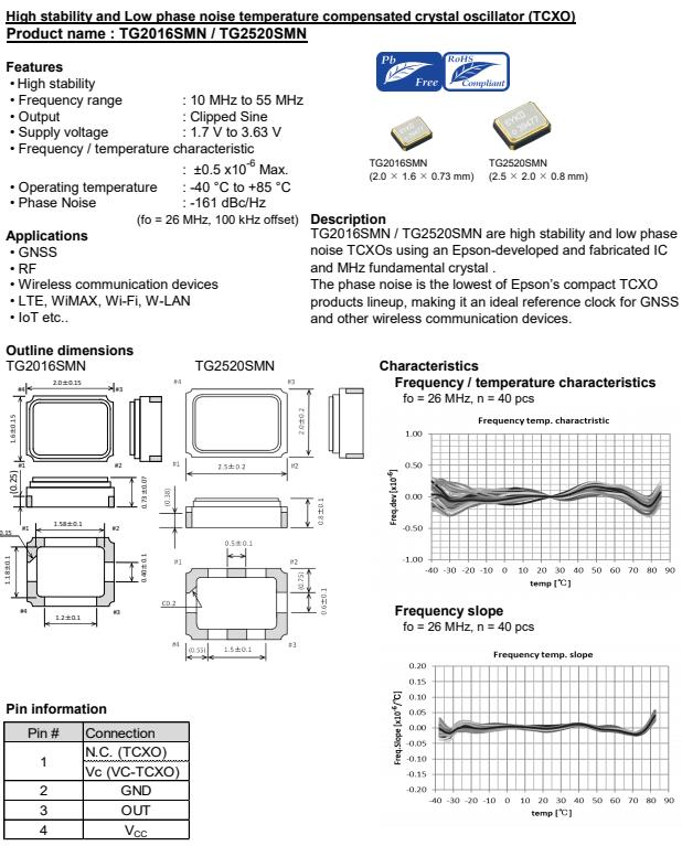 | X1G005421030227 | TG2520SMN | 16.369000 MHz | 2.50 x 2.00 x 0.80 mm | 2.660 to 3.465 V | +/-1.5 ppm | -40 to +85 °C | +/-0.50 ppm |