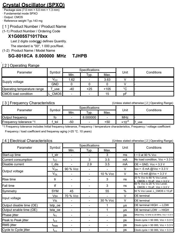 | X1G005571017000 | SG-8018CA | 8.000000 MHz | 7.00 x 5.00 x 1.40 mm | CMOS | 1.620 to 3.630 V | -40 to 105 °C |