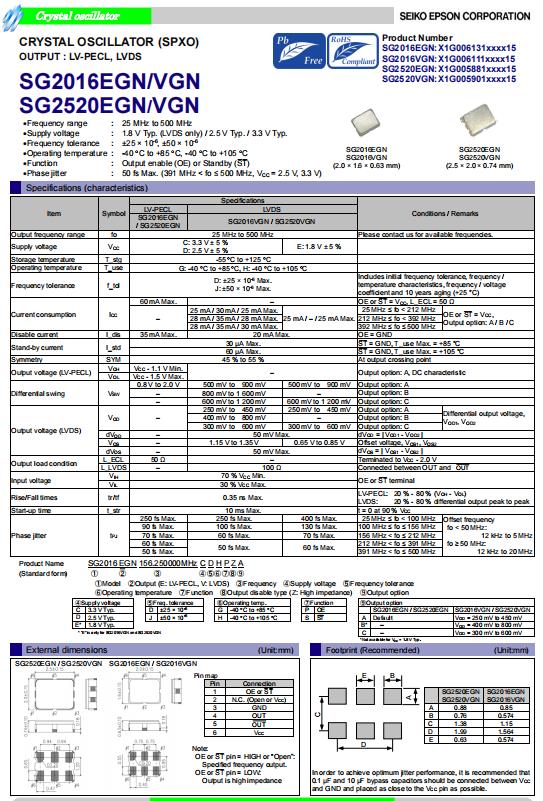 | X1G005881000515 | SG2520EGN | 156.250000 MHz | 2.50 x 2.00 x 0.84 mm | LV-PECL | 3.135 to 3.465 V | -40 to 105 °C | +/-50 ppm |