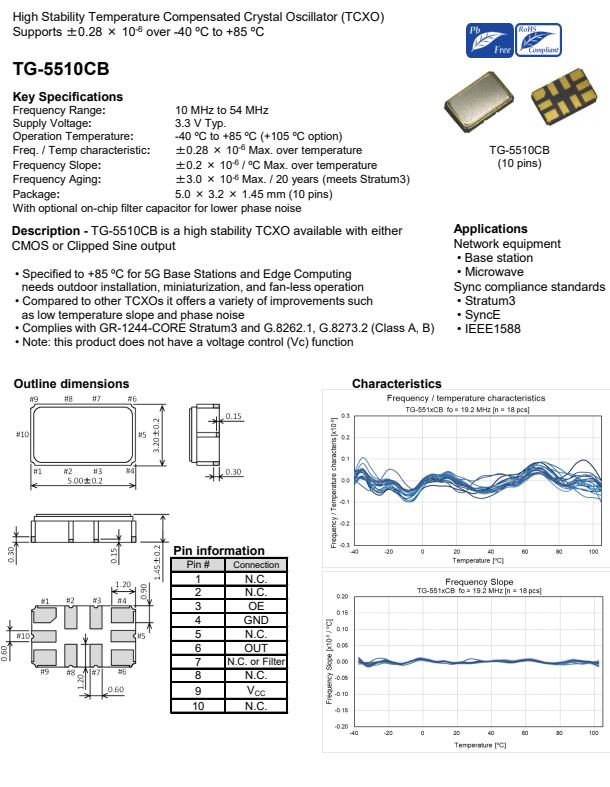 | X1G005241000700 | TG5032SGN | 10.000000 MHz | 5.00 x 3.20 x 1.45 mm | Clipped sine wave | 3.135 to 3.465 V | +/-1.0 ppm | -40 to ++85 °C |