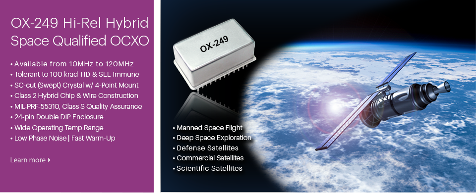 說到OCXO晶振在航天航空上的應用,讓我想到美國的Vectron國際公司。美國Vectron International(維管國際)是世界領先的頻率控制、傳感器和混合產(chǎn)品解決方案的設計、制造和營銷的領導者,總部設在美國密歇根哈德遜,產(chǎn)品包括晶體和晶體振蕩器,頻率轉換器,時鐘和數(shù)據(jù)恢復產(chǎn)品,表面聲波濾波器,晶體濾波器和用于電信、數(shù)據(jù)通信、頻率合成器、定時、導航、軍事、航空和儀表系統(tǒng)的組件。在水晶振蕩器和濾鏡設計方面都以其技術能力而聞名。公司提供的創(chuàng)新和能力反映了高頻率、低成本設計和小型化的趨勢,以及更先進的綜合解決方案。其中一些關鍵技術包括: ASIC設計、表面安裝技術、陶瓷封裝、混合制造到類“S”、“高頻基礎”(HFF)晶體設計和空間組件能力。美國威克創(chuàng)國際擁有突出的高頻基協(xié)波和SC切割晶體的離散晶體技術,及100級和10000級潔凈室設施生產(chǎn)領先前沿的陶瓷包裝VCXO晶振。Vectron國際公司的核心技術包括經(jīng)典水晶、表面聲波濾波器技術和復雜的集成電路和先進的包裝。Vectron晶振最新的 OX–249晶振用普通的太空用途的溫補晶振的封裝實現(xiàn)SC切割恒溫晶振的性能,填補了存在于小體型、低能量和大尺寸、高能量的太空用途的恒溫晶振之間所呈現(xiàn)的成本、尺寸、性能的缺口, Vectron國際的方案實現(xiàn)了性能和小型化的有力結合。OX–249晶振主要用于人造空間飛行器、深度空間探測、國防衛(wèi)星、商業(yè)衛(wèi)星和科學衛(wèi)星。