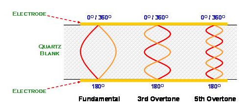 在AT切割角度的石英晶體共振子主要是以厚度剪切振蕩模態存在. 石英晶體在共振時, 除了基本波振蕩之外, 高階的倍頻共振也與基本波振蕩同時存在于石英晶體的電極區域之間. 但是, 由于壓電材料的電極是電氣相位相反的振動環境, 所以, 祇有奇數倍(odd number)的高頻倍頻可以發生, 偶數倍(even number)的倍頻共振在石英晶體共振子是不會存在的(圖).