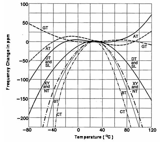 大部份的石英晶體產品是用于電子線路上的參考頻率基準或頻率控制組件, 所以, 頻率與工作環境溫度的特性是一個很重要的參數. 事實上, 良好的頻率與溫度(frequeny versus temperature)特性也是選用石英做為頻率組件的主要因素之一. 經由適當的定義及設計, 石英晶體組件可以很容易的就滿足到以百萬分之一 (parts per million, ppm) 單位等級的頻率誤差范圍. 若以離散電路方式將LCR零件組成高頻振蕩線路, 雖然也可以在小量生產規模達到所需要的參考頻率信號誤差在ppm或sub-ppm等級要求, 可是這種方式無法滿足產業要達到的量產規模. 石英組件的頻率對溫度特性更是離散振蕩線路無法簡易達成的. 在(圖四) 中提供了數種不同的石英晶體切割角度的頻率對溫度特性曲線.