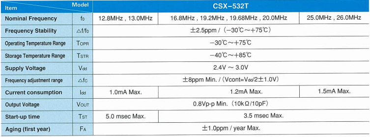CSX-532T進口晶振,5032mm有源晶振,CITIZEN晶體振蕩器,高密度SMD類型5.0*3.2*1.5mm,頻率范圍12.8MHZ~26MHZ,頻率和電壓控制的功能,可在2.4 v低電壓驅動,低電流消耗,自動安裝和回流類型,最適合手機、GPS與電信設備和其他設備.