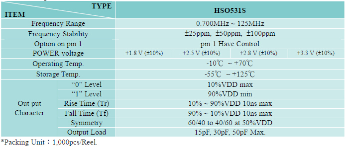HSO531S振蕩器,HELE晶振原裝正品,24MHz有源晶振,尺寸大小5.0*3.2*1.3mm,工作電壓1.8~3.3V,頻率范圍0.700 to 125.0MHZ,工作溫度-10~+70℃耐高溫環境,三態函數應用于視覺的產物.被廣泛應用于,平板筆記本,GPS系統,光纖通道,千兆以太網,串行ATA,串行連接SCSI,PCI-Express的SDH / SONET發射基站等領域.符合RoHS/無鉛.