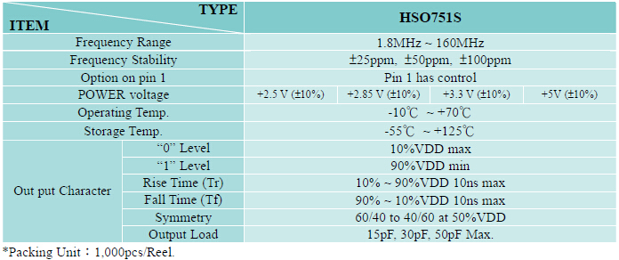 加高電子晶振,HSO751S有源晶振,石英晶體振蕩器,尺寸大小5.0*7.0*1.4mm,CMOS輸出晶體振蕩器,頻率范圍1.8 to 160.0MHZ,工作溫度-10~+70℃耐高溫環境,三態函數應用于視覺的產物,該款SMD振蕩器主要應用于:PCMCIA卡,CCD,便攜式電,無線局域網.