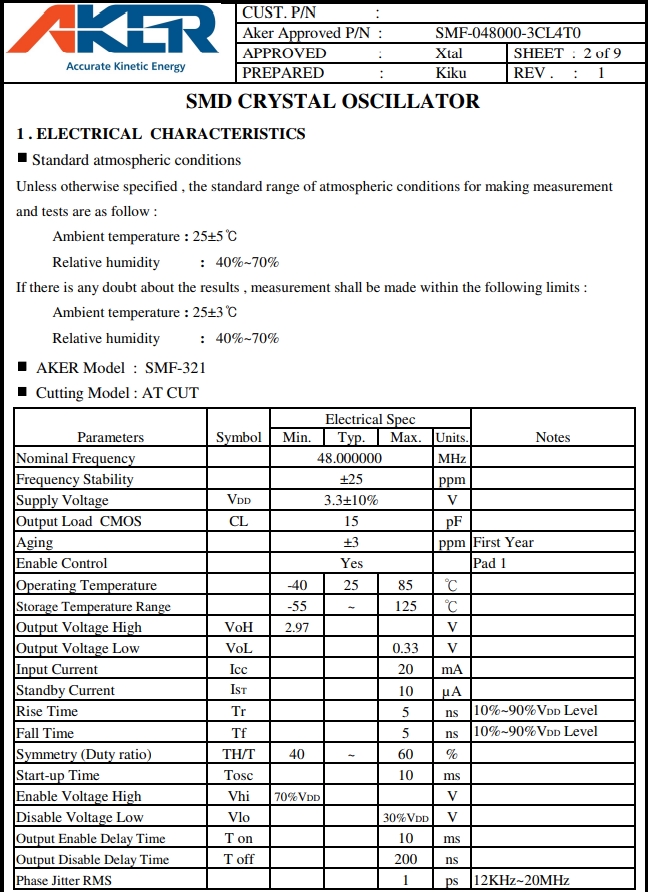 | 頻率 | 48MHz | 負(fù)載 | 15pF | 溫度范圍 | -40~ +85℃ |