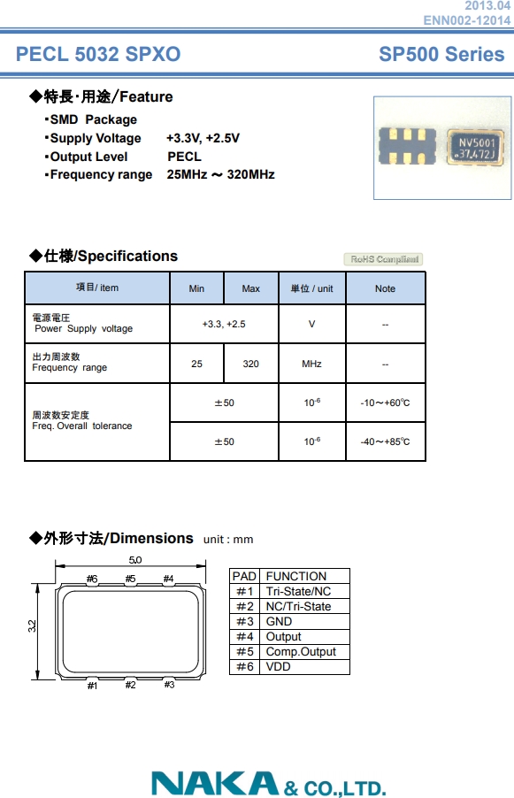 NAKA晶振,有源晶振,SP500振蕩子.有源石英晶振,外觀完全使用金屬材料封裝的,產品本身采用全自動石英晶振檢測儀,以及跌落,漏氣等苛刻實驗.產品本身具有高穩定性,高可靠性的石英晶體振蕩器,焊接方面支持表面貼裝,外觀采用金屬封裝,具有充分的密封性能.