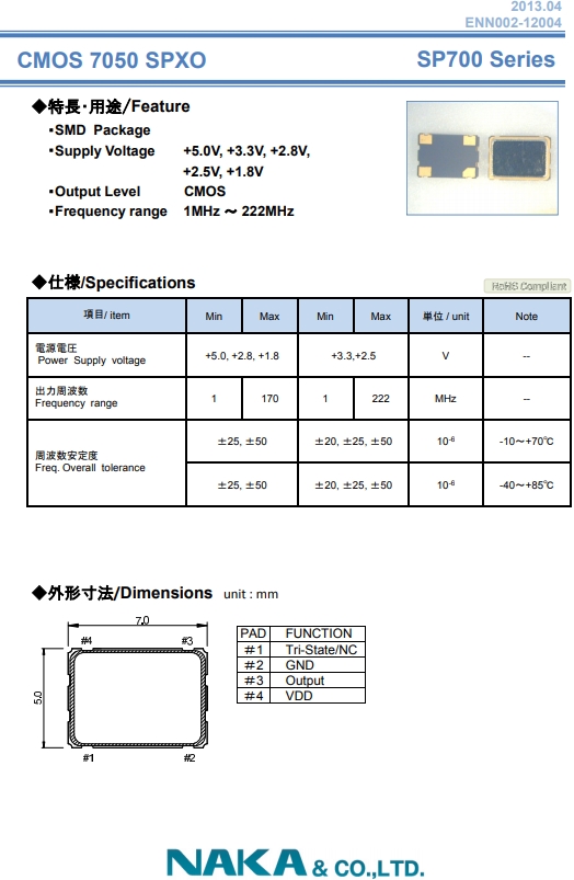 NAKA晶振,crystal OSC,SP700納卡有源晶振.有源貼片石英晶振外觀使用金屬材料封裝的,具有高穩(wěn)定性,高可靠性的石英晶體振蕩器,晶振外觀本身使用金屬封裝,充分的密封性能,可確保其高可靠性,采用編帶包裝,外包裝采用朔膠盤,可在自動(dòng)貼片機(jī)上對(duì)應(yīng)自動(dòng)貼裝等優(yōu)勢(shì).
