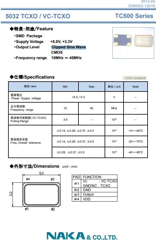 NAKA晶體,NAKA Crystal,TC500有源晶振.溫補晶振(TCXO)產(chǎn)品本身具有溫度補償作用,高低溫度穩(wěn)定性:頻率精度高0.5PPM~2.0PPM,常用頻率:26M,33.6M,38.4M,40M.因產(chǎn)品性能穩(wěn)定,精度高等優(yōu)勢,被廣泛應(yīng)用到一些比較品質(zhì)的數(shù)碼通訊產(chǎn)品領(lǐng)域,導(dǎo)航定位系統(tǒng),智能手機,WiMAX和無線通信等產(chǎn)品,符合RoHS/無鉛.