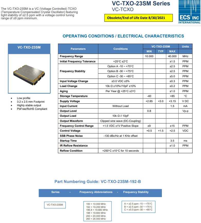 | VC-TXO-23SM-192-B | ECS晶振 | VC-TXO-23SM | 19.2MHz | -30°C ~ 75°C |