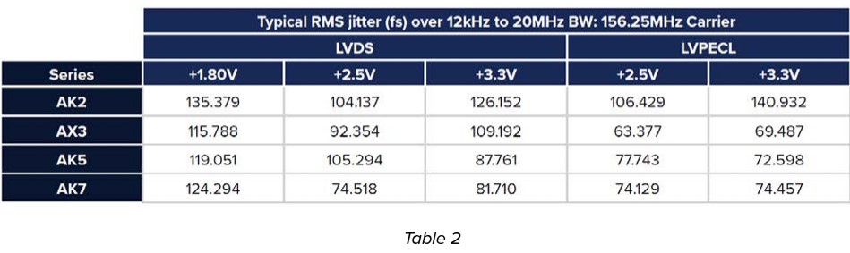AK2、AX3、AK5和AK7解決方案提供卓越的RMS抖動性能,遠低于200fs的典型系統(tǒng)級最大要求。對于需要保證最大100fs RMS抖動性能的系統(tǒng),當偏置在+3.3V時,AK5和AK7解決方案都通過LVDS或LVPECL輸出格式滿足這一要求。