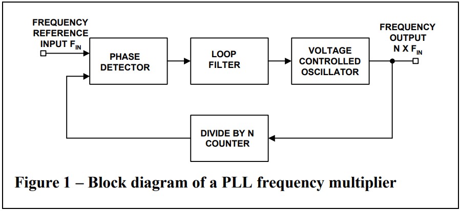 圖1包含了一個(gè)基本的PLL頻率乘法器的方框圖。該電路的操作是所有鎖相環(huán)的典型操作。它基本上是一個(gè)控制壓控晶體振蕩器(VCO)相位的反饋控制系統(tǒng)。將輸入信號(hào)應(yīng)用于相位檢測(cè)器的一個(gè)輸入端。另一個(gè)輸入被連接到一個(gè)除以N個(gè)計(jì)數(shù)器的輸出上。通常情況下,這兩個(gè)信號(hào)的頻率將幾乎相同。相位檢測(cè)器的輸出是與兩個(gè)輸入之間的相位差成比例的電壓。此信號(hào)應(yīng)用于回路貼片濾波器。它是一個(gè)循環(huán)濾波器,它決定了PLL的動(dòng)態(tài)特性。濾波后的信號(hào)控制著VCO。請(qǐng)注意,VCO的輸出頻率是提供給頻率參考輸入的輸入的N倍。這個(gè)輸出信號(hào)通過除以N個(gè)計(jì)數(shù)器被發(fā)送回相位檢測(cè)器。