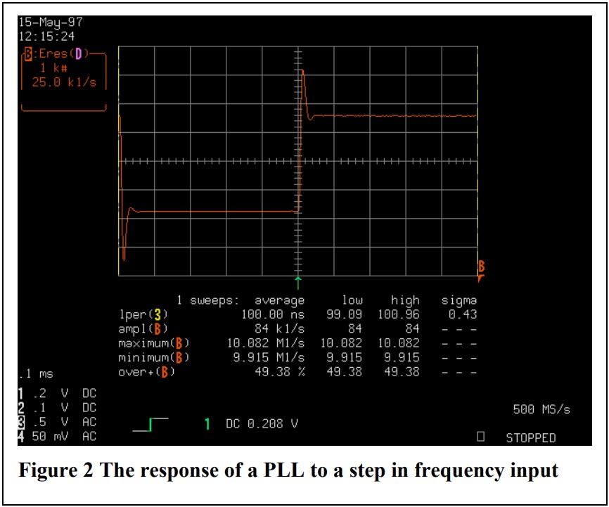 圖2顯示了PLL動(dòng)態(tài)響應(yīng)的一個(gè)典型測(cè)量實(shí)例。該P(yáng)LL用于頻率合成器,并顯示了對(duì)10 MHz參考輸入中的80 kHz步長(zhǎng)的響應(yīng)。該電路的捕獲范圍約為+/-中心頻率的5%