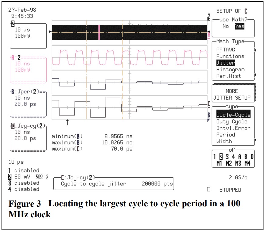 LeCroy示波器有多種方法可以用于PLL測(cè)量。石英晶振現(xiàn)代的高性能微處理器經(jīng)常使用內(nèi)部的PLL來增加系統(tǒng)時(shí)鐘頻率。制造商指定系統(tǒng)時(shí)鐘上允許的最大周期到周期變化。一個(gè)典型的特征是最大抖動(dòng)小于250ps。由于PLL的輸出是不可訪問的,因此系統(tǒng)時(shí)鐘輸入滿足這個(gè)規(guī)范是很重要的。工程師可以通過使用抖動(dòng)軌道循環(huán)循環(huán)測(cè)量系統(tǒng)時(shí)鐘來驗(yàn)證系統(tǒng)時(shí)鐘是否符合本規(guī)范。這一點(diǎn)如圖3所示。在100us記錄的最大周期到周期周期差異是70ps。該值直接從Jitter跟蹤循環(huán)中讀取到軌跡c中的循環(huán)波形。垂直參數(shù)游標(biāo)之間的區(qū)域標(biāo)記為最大值。跟蹤A是采集數(shù)據(jù)的縮放放大,顯示了差異最大的兩個(gè)相鄰周期。軌跡B是抖動(dòng)軌跡周期,它讀取時(shí)鐘波形的每個(gè)周期的絕對(duì)周期。